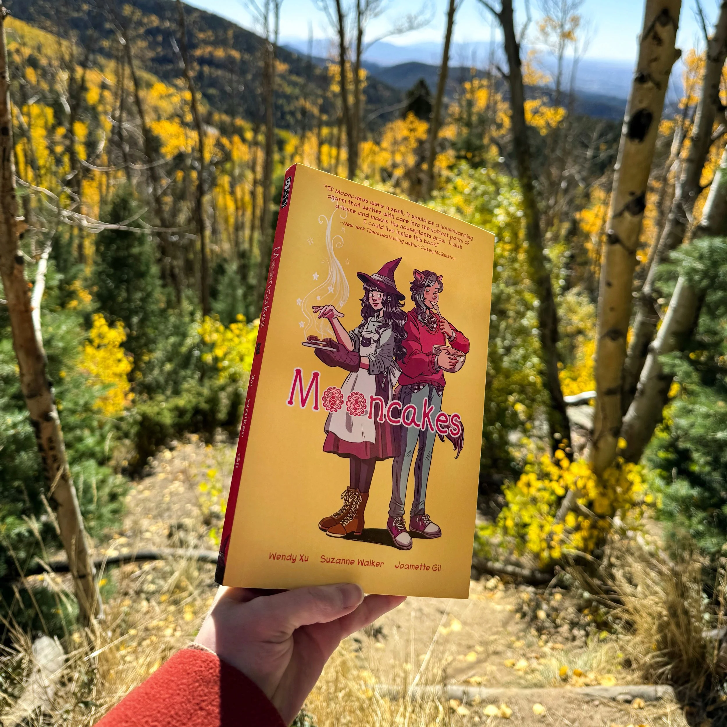 [ID: A white hand in a red coat holding a yellow book with an illustration of two figures on it, one in a pointed witch hat holding a plate of mooncakes and the other with blue hair and a red sweatshirt with a bowl of batter. The font spelling out “Mooncakes” in red has an illustration of two mooncakes as the Os in the title. The book is in front of a mountain view framed by golden-yellow aspens. The mountains behind are blue with scattered evergreens.]