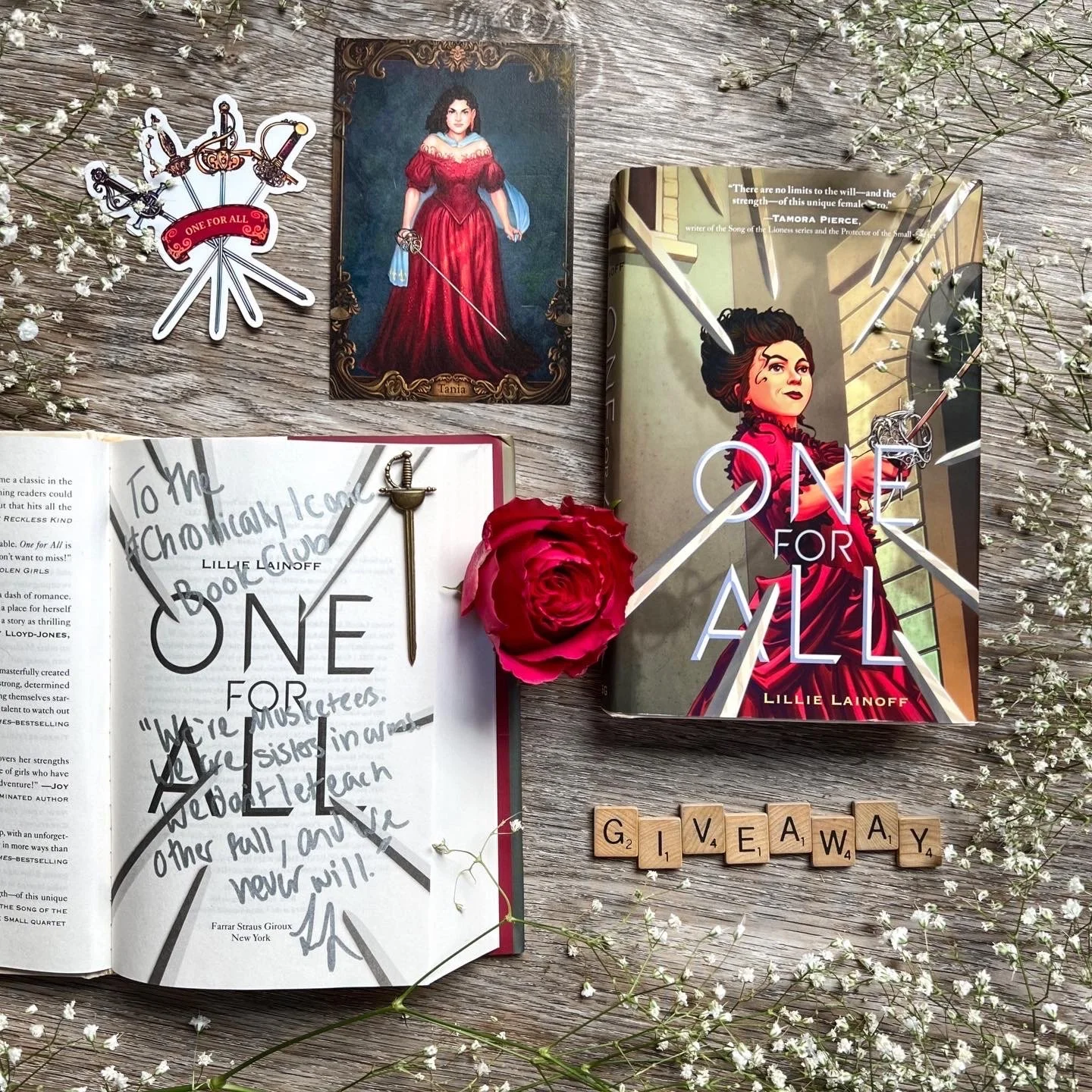 [ID: A book with an illustration of a brown haired girl in a pink dress at sword point laying on a gray wooden floor surrounded by baby’s breath. An open page of another book has the inscription: “To the Chronically Iconic Book Club. We’re Musketeers. We are sisters in arms. We don’t let each other fall, and we never will. LL.” A brass sword bookmark lays on the page and a sticker saying “one for all” sits to the right of the book next to an illustration of the main character Tania in a pink dress looking fierce. Scrabble tiles spelling out “giveaway” are spread out under the book. A bright pink rose sits in the middle.]